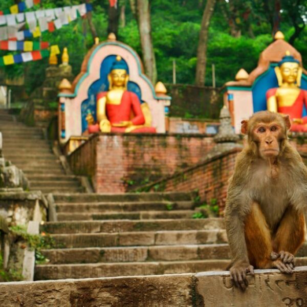 The lively population of monkeys inhabiting the surrounding area aptly earns the moniker “Monkey Temple” for this site. These playful and mischievous creatures have become an integral part of the temple’s identity, adding a touch of whimsy to the sacred atmosphere. While basking in the panoramic views of the Kathmandu Valley below, visitors often find entertainment in the antics of these primates.
